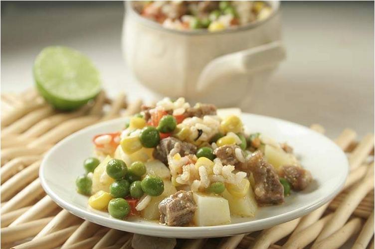 - Umiješajte mljevenu papriku, začine od povrća, pola količine vode i nastavite pirjati dok meso ne omekša. Nakon toga dodajte rižu, kukuruz šećerac, grašak, svježu papriku narezanu na kockice i preostalu vodu.