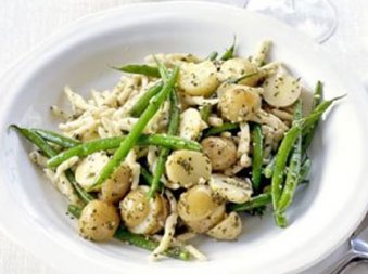 - Ocijedite mahune i krompir. Dodajte na tjesteninu i zalijte pestom i sokom od limuna.