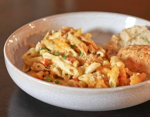 - U jednoj posudi izmješajte tjesteninu, špinat, tunjevinu, smjesu od mlijeka i brašna, naribani sir i limunov sok. Stavite smjesu u posudu za pečenje. U manjoj posudi izmiješajte prezlu, naribani sir, maslac i senf, pa tu smjesu razmažite po vrhu posude za pečenje. Pecite 25-30 minuta na 200 C.