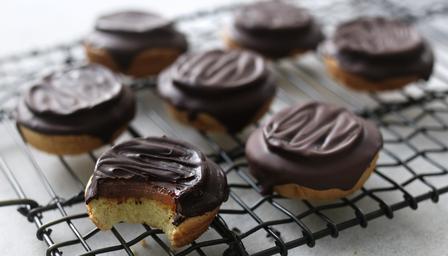 - Čokoladu otopiti na najnižoj temperaturi ili u mikrotalasnoj 10 minuta na 180 W, bez dodavanja ičega. Razmazati je u tankom sloju na masni papir, u površini 20x30 cm, na dva mijesta. Kad se stegne, iz svake table vaditi krugove, istom ili malo većom modlom od one kojom je sečen biskvit. Modlu ugrejati pre otiskivnja krugova. Čokoladne krugove postaviti preko biskvita sa želeom i ugrejati odozgo (moze u blago zagrijanoj rerni) da se ocrta krug želea, i da se čokolada priljepi za keks. Ostaviti da se galzura stegne.