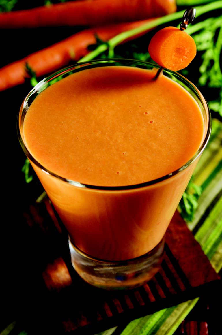 - Napitak sipajte u duguljastu čašu i ukrasite mrkvom.